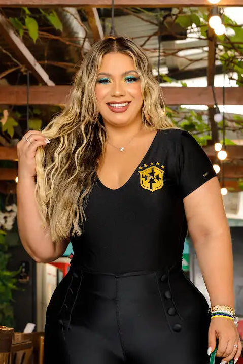 Conta com meia manga e decote mais aberto, trazendo equilíbrio entre sensualidade e elegância. Possui fecho entre as pernas, proporcionando praticidade no uso.