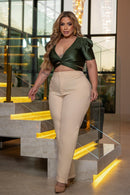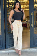 Com caimento impecável, modelagem reta e cintura alta, valoriza a silhueta sem abrir mão da liberdade de movimento. O fechamento frontal possui botão encapado e zíper invisível, além de bolsos funcionais e recorte estratégico no bumbum que realça as curvas de forma sutil e moderna.