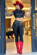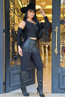 Calça Western | Malha Prada com Courino e Franjas Frontais