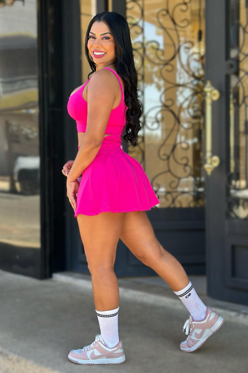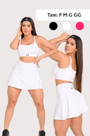 Conjunto esportivo e fashion, composto por top e short saia, ideal para quem busca conforto e estilo em um único look.