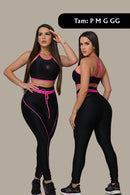 Conjunto fitness com top e calça legging em tecido com brilho sutil, toque macio e alta elasticidade.