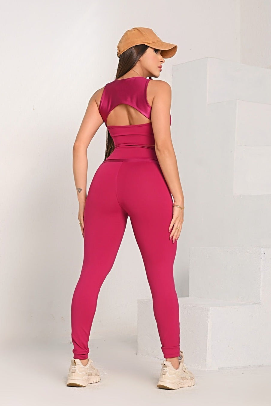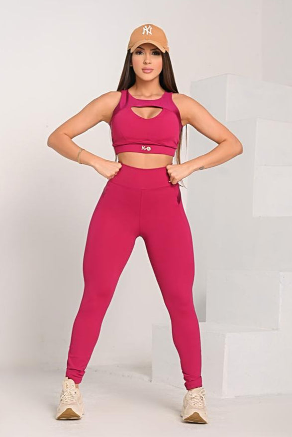 Conjunto esportivo composto por top e calça legging, ambos com modelagem ajustada que valoriza as curvas e proporciona firmeza para todos os movimentos. O top possui recorte moderno no busto, que confere um charme extra e sofisticação ao visual. A calça, com cintura alta e cós anatômico, modela a silhueta e garante conforto durante o uso.