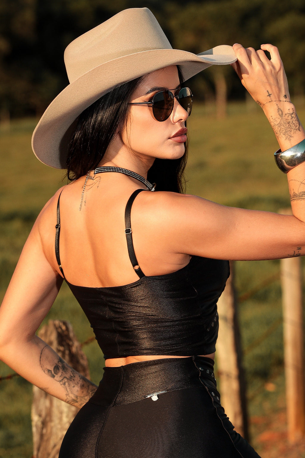 Os recortes estratégicos e as aplicações de ilhoses metálicos trazem um toque moderno e diferenciado ao design, tornando a peça perfeita para produções elegantes e cheias de atitude.