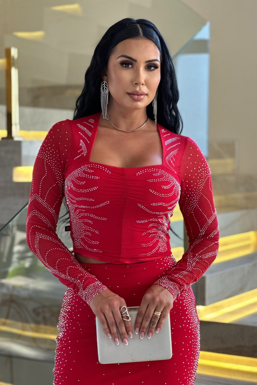 As mangas longas em tule adicionam leveza e sofisticação, enquanto as aplicações em strass trazem um brilho irresistível que transforma qualquer produção.