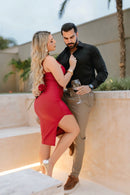 Vestido midi vermelho com modelagem justa, fenda lateral e recorte abaixo do busto. A escolha ideal para quem quer se destacar com charme e sofisticação.