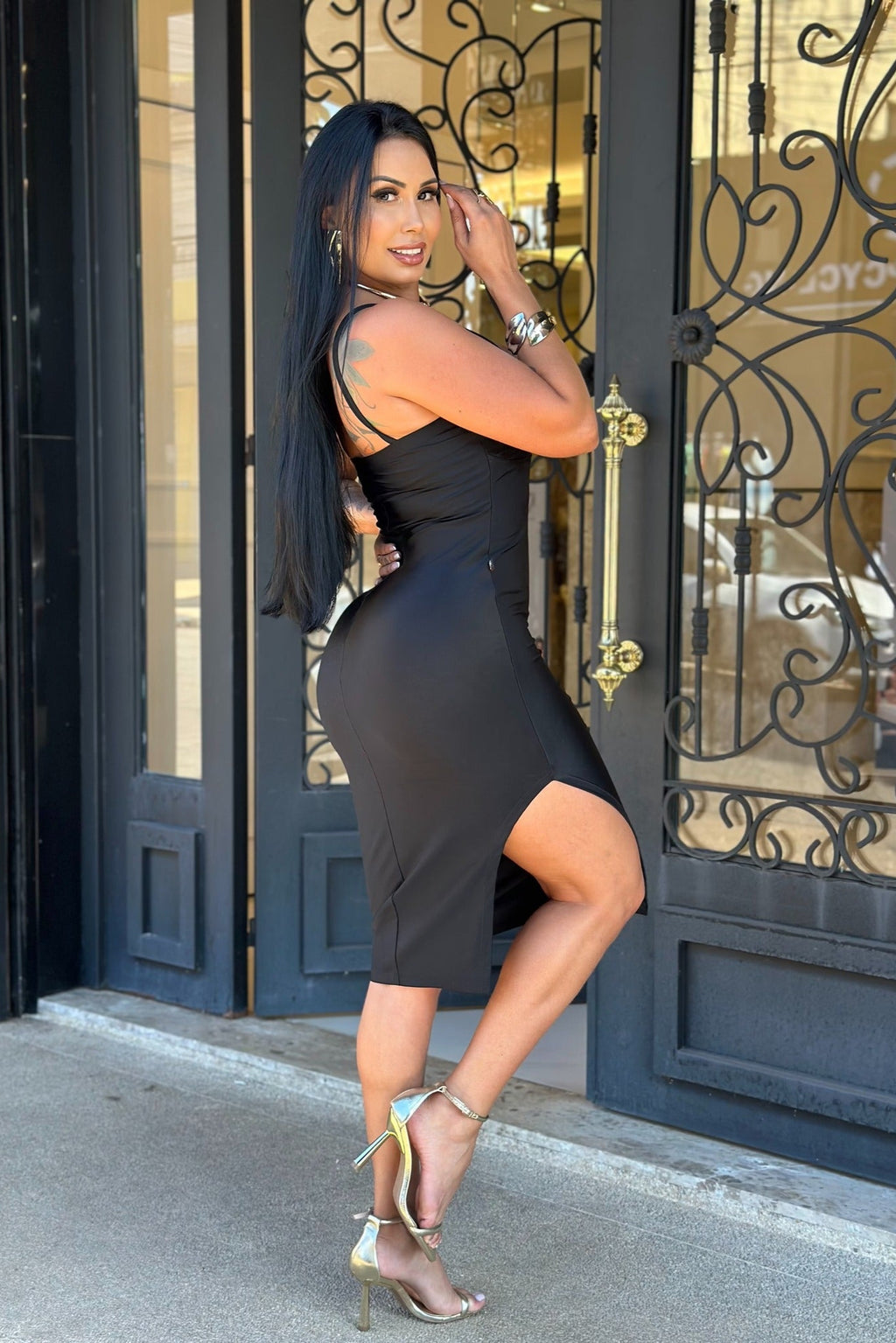 O comprimento midi, aliado à fenda lateral, proporciona liberdade de movimento e um toque ousado. O recorte sutil abaixo do busto realça o colo de maneira elegante, enquanto as alças finas conferem delicadeza ao visual.